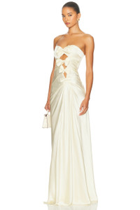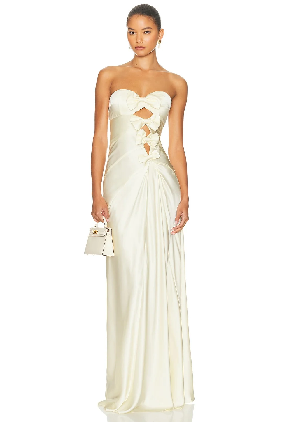 Details - Satin textile - Dry clean recommended - Unlined - Hidden back zipper closure - Front cut-out detail with bow details - Ruched satin fabric - Made in China - Our Style No. HLSA-WD240 - Manufacturer Style No. HED10006 U25