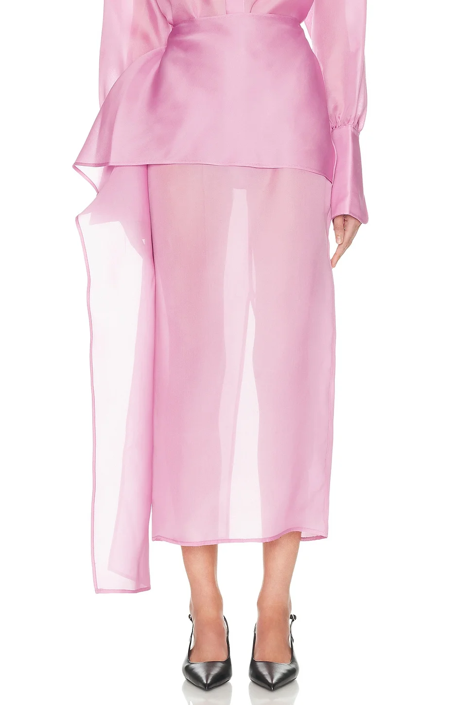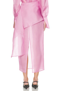 - 100% silk - Dry clean only - Unlined - Hidden back zipper closure - Organza fabric with back vent and overlay draped fabric accent - Garment is made with a semi-sheer fabric, undergarments can show through - Item not sold as a set - Waist to shortest hem measures approx 20" and to longest hem approx 37" in length - Revolve Style No. HLSA-WQ82 - Manufacturer Style No. HEQ10005 F25