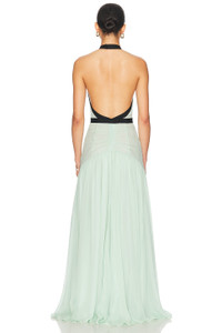 Details - Self: 100% silk - Lining: 100% polyester - Dry clean only - Fully lined - Halterneck hook and bar clasp closure - Hidden back zipper closure - Front V-neckline with bow detail - Open back - Chiffon fabric - Made in China - Our Style No. HLSA-WD205 - Manufacturer Style No. HED182 U25