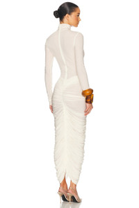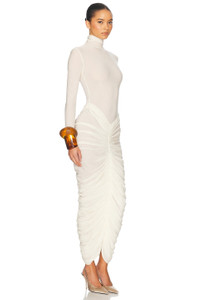 Details - 54% nylon, 46% elastane - Made in China - Hand wash - Partially lined - Hidden back zipper closure - Mockneck styling - Jersey fabric with ruching detail - Our Style No. HLSA-WD189 - Manufacturer Style No. HEQ56 S25