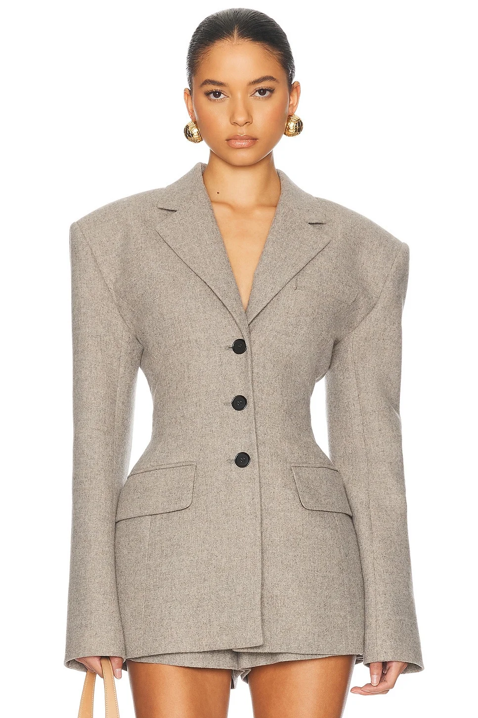 Details - Self: 39% wool, 29% polyester, 17% polyamide, 12% viscose, 2% other fibers, 1% elastane - Lining: 55% polyester, 45% viscose - Made in Portugal - Dry clean - Front button closure - Padded shoulder and buttoned cuff - Breast welt pocket and front flap pockets - Midweight brushed wool with darted waist - Our Style No. HLSA-WO54 - Manufacturer Style No. HEOW55 S25