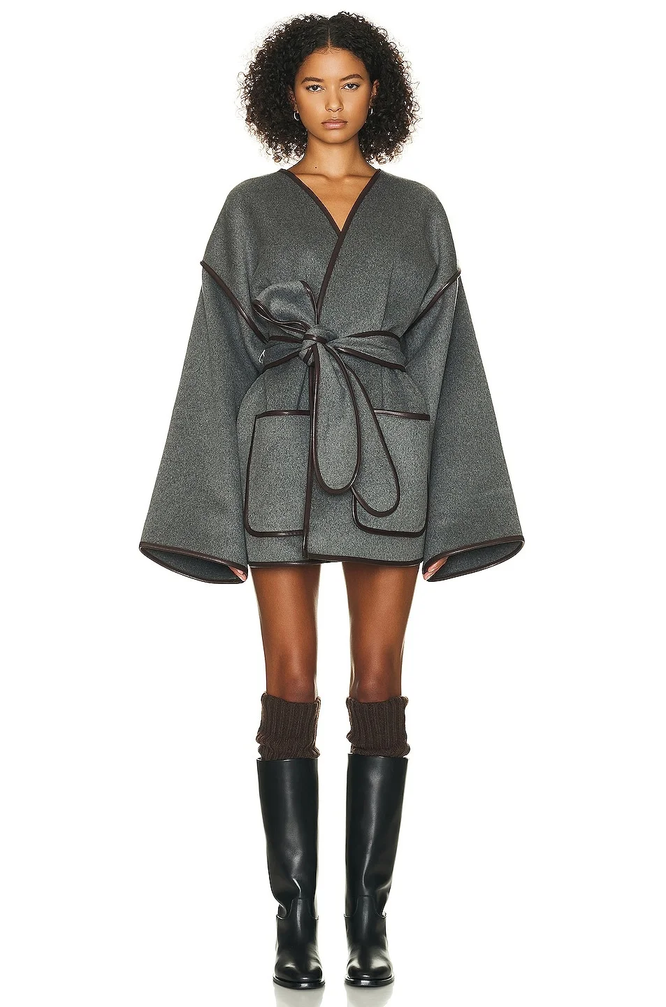 Details - Self: 47% wool, 44% polyester, 5% acrylic, 3% nylon, 1% rayon - Contrast Fabric: 50% polyester, 50% polyurethane - Made in China - Dry clean only - Open front with removable waist tie closure - Front patch pockets - Oversized fit - Our Style No. HLSA-WO15 - Manufacturer Style No. HEOW23 F23