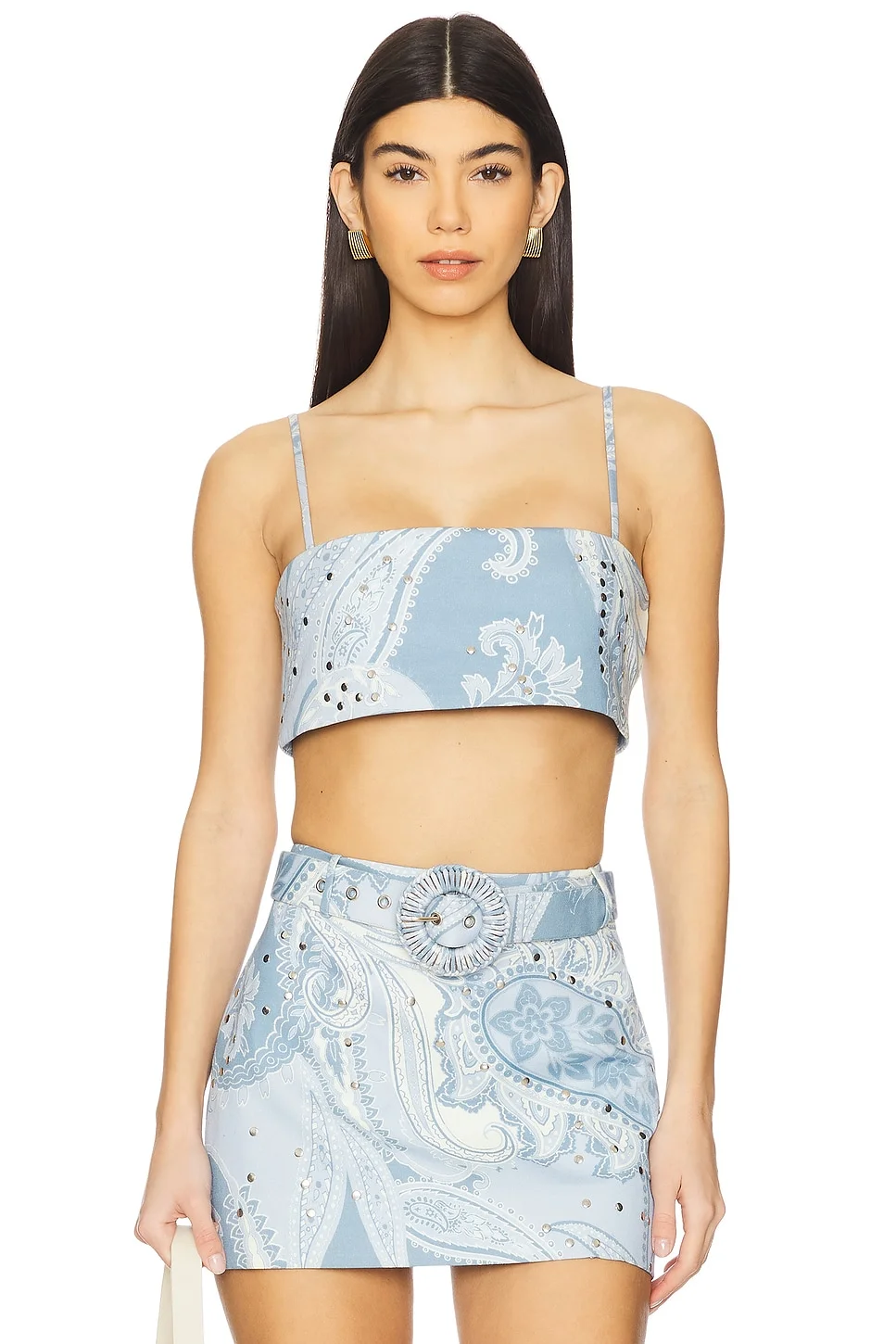- 100% cotton - Made in India - Dry clean only - Hidden side seam zipper closure - Midweight twill fabric with silver metal detailing - Adjustable straps and elastic back - Item not sold as set - Revolve Style No. BENE-WS147 - Manufacturer Style No. HN-FIZA-BLU-6014