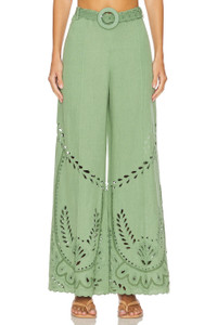- 55% linen 45% cotton - Made in India - Dry clean only - Hidden side zipper closure - Optional belt at waist.4-pocket design - Eyelet fabric design at lower leg Item not sold as a set.26" at the knee breaks to 30" at the leg opening - Revolve Style No. BENE-WP38 - Manufacturer Style No. HN-ALYA-5840