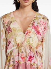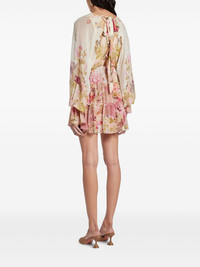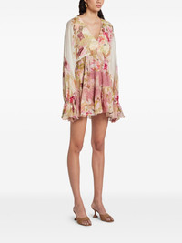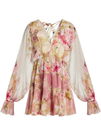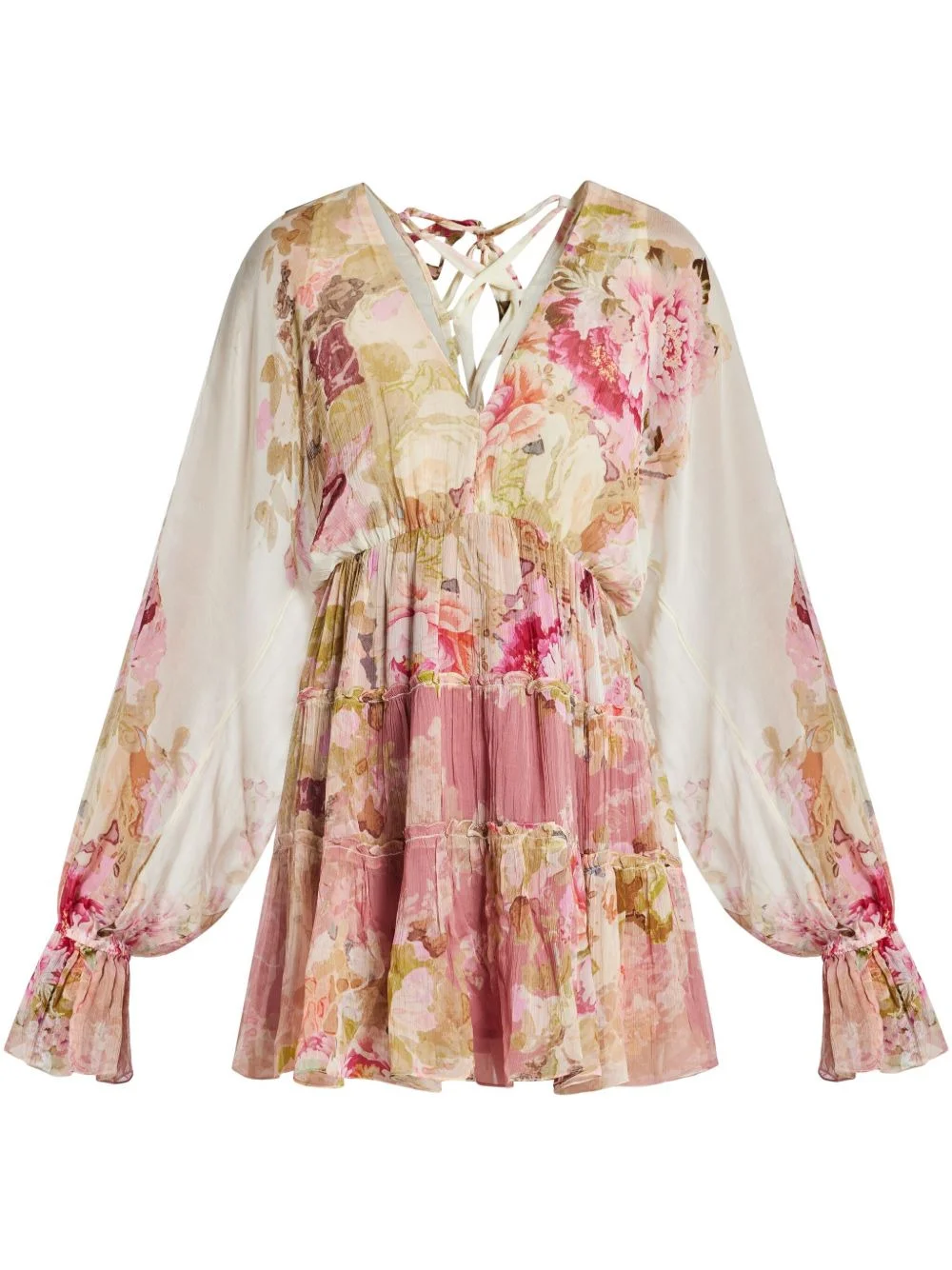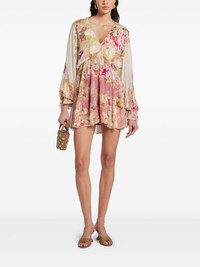 floral-print mini dress Highlights - Light pink - Rear tie fastening - V-neck - Long puff sleeves - Flared hem Imported Composition Viscose 100% Washing instructions Dry Clean Only