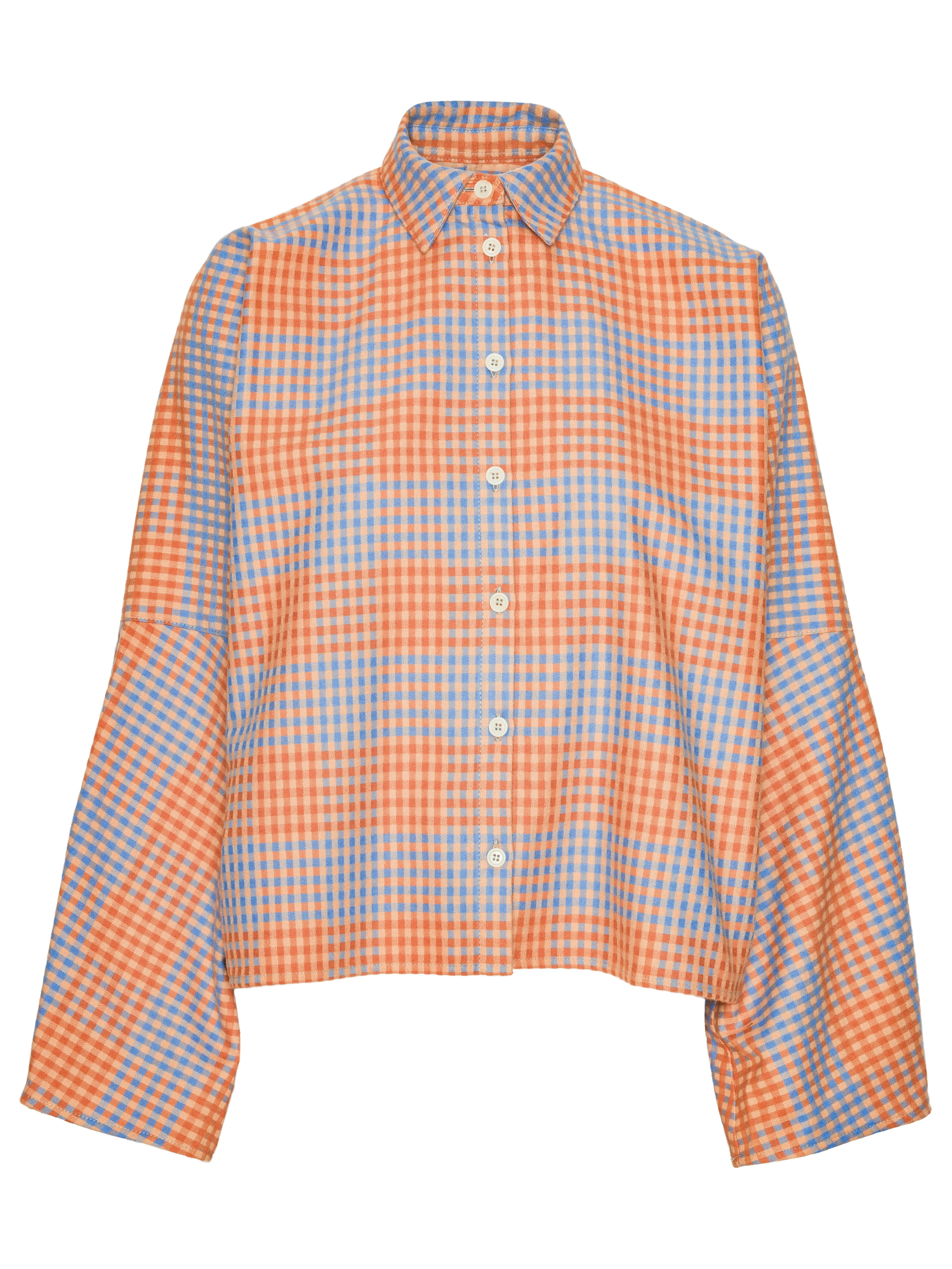 Banana Blouse in Zuzu Checks from Henrik Vibskov AW25 Key Collection Highlights - orange and blue - checks - collar - front button closure - long sleeves - cropped hem Model is 181cm tall and is wearing a size S Made in Bulgaria Designer ID: AW25KEY-F205 Colour ID: Zuzu Checks Materials 100% Organic Cotton