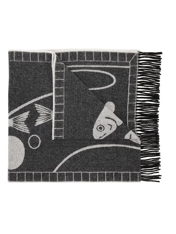 Catch Match Scarf in Catch Match Black from Henrik Vibskov's Autumn Winter 2025 Studio collection "A Bit Overwhelmed by the Opaque Resonance" Highlights - black-grey - wool - white fish illustration - fringe edges Made in Italy Designer ID: AW25STUD-A918 Colour ID: 912 Catch Match Black Materials 90% Recycled Wool 10% Wool