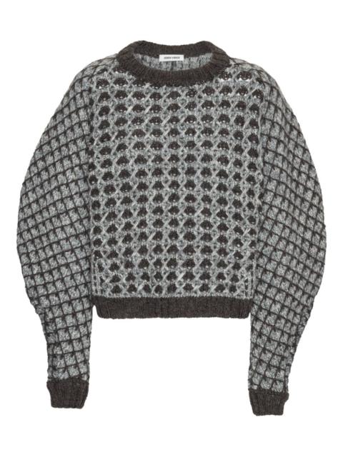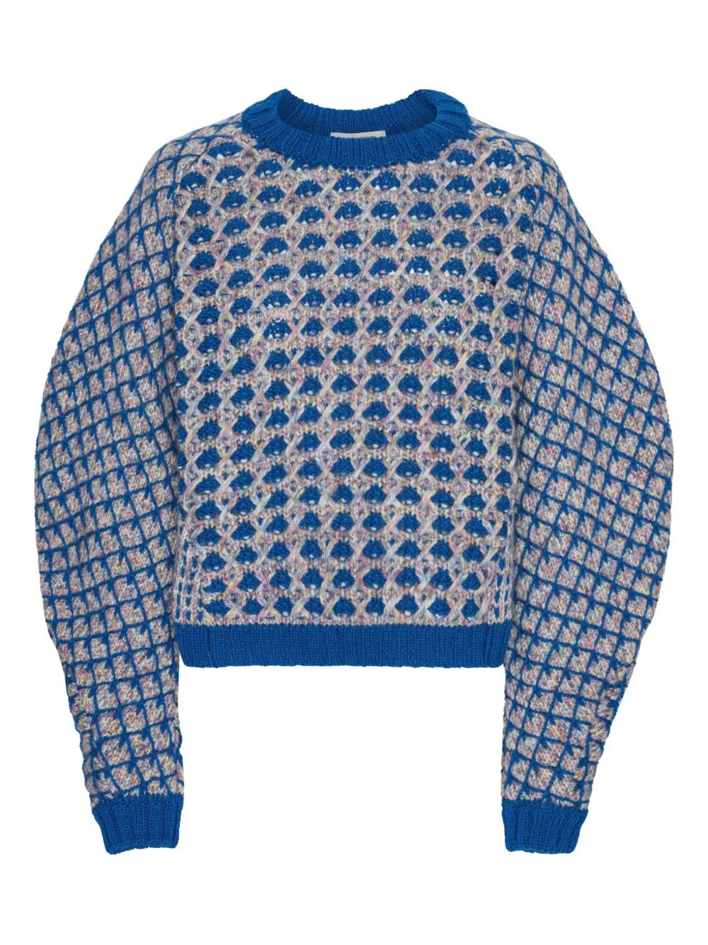 geometric-pattern sweater Highlights - Blue - Geometric knit-pattern - Crew neck - Balloon sleeves Imported Composition Fabric 100% Washing instructions Read Manufacturer Guidelines