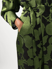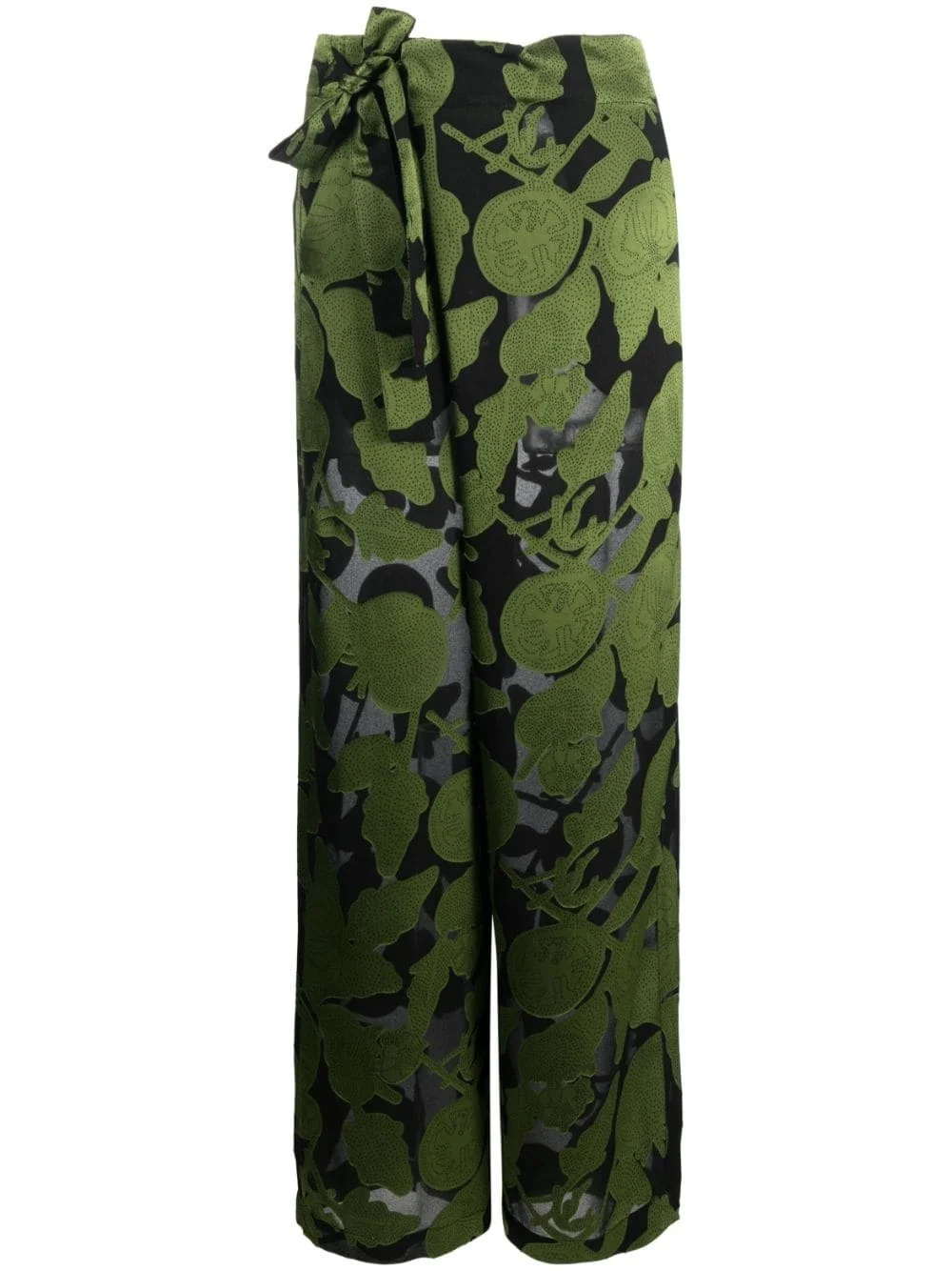 graphic-print wrap trousers Highlights - Forest green/black - All-over graphic print - High-waisted - Tied waist - Two side slit pockets - Straight leg - Straight hem Imported Composition Viscose 67%, Polyester 33% SIZE & FIT Model measurements Height 5 ft 11 in(1.8 m) Bust/Chest 31.88 in(81 cm) Hips 35.03 in(89 cm) Waist 24.01 in(61 cm) FittingInformation Designed with a wide-leg cut, these trousers allow for a close fit at the waist and offer a loose and roomy fit over the leg The tie fastening gives an adaptable and personalised fit Made from a lightweight non-stretch fabric This piece fits true to size – take your usual size
