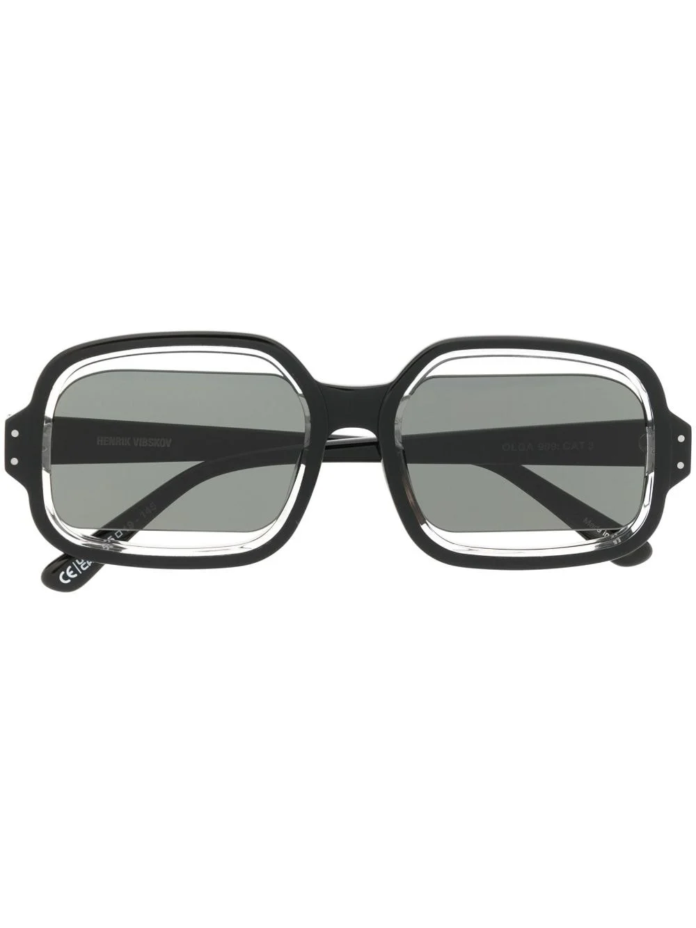 Olga square-frame sunglasses Highlights - Black - Acetate - Grey tinted lenses - Curved tips - Shield frame - These glasses come with a protective case. Imported Composition Acetate 100% SIZE & FIT Measurement Arm Length 5.7 in(14.5 cm) Bridge Width 0.74 in(1.9 cm) Lens Diameter 2.16 in(5.5 cm) Total Width 5.9 in(15 cm)