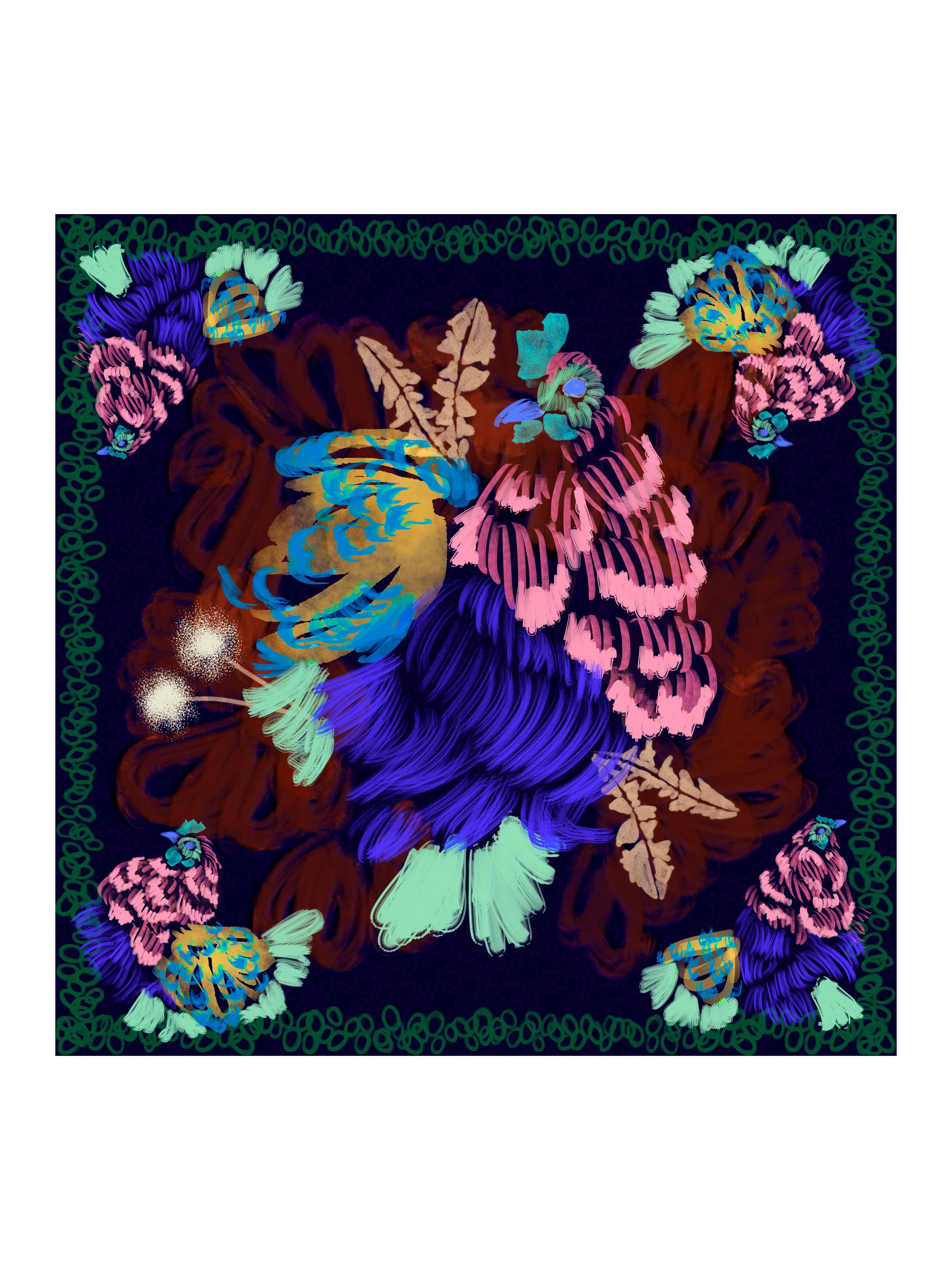 Chicken Scarf in Chickens from Henrik Vibskov Spring/Summer 2026 Studio Collection ‘Everything Cracks Eventually – I’ll Be Gentle.’ Highlights - navy - chicken illustration - square shape Made in Bulgaria Designer ID: SS26STUD-A902 Colour ID: 821 Chickens Materials 53% Cupro 47% Viscose