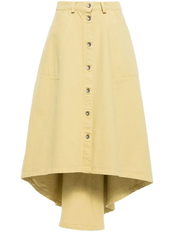 Regain Denim Skirt in Hemp from Henrik Vibskov's Spring Summer Key 2024 collection. Highlights - creme yellow - skirt - denim twill - buttoned down in front - high waist - asymmetric hem - belt straps - pockets in front - pocket on the back Made in Portugal Designer ID: SS24KEY-F404 Colour ID: 201 Hemp Materials 50% Cotton 25% Organic Cotton 25% Recycled Cotton