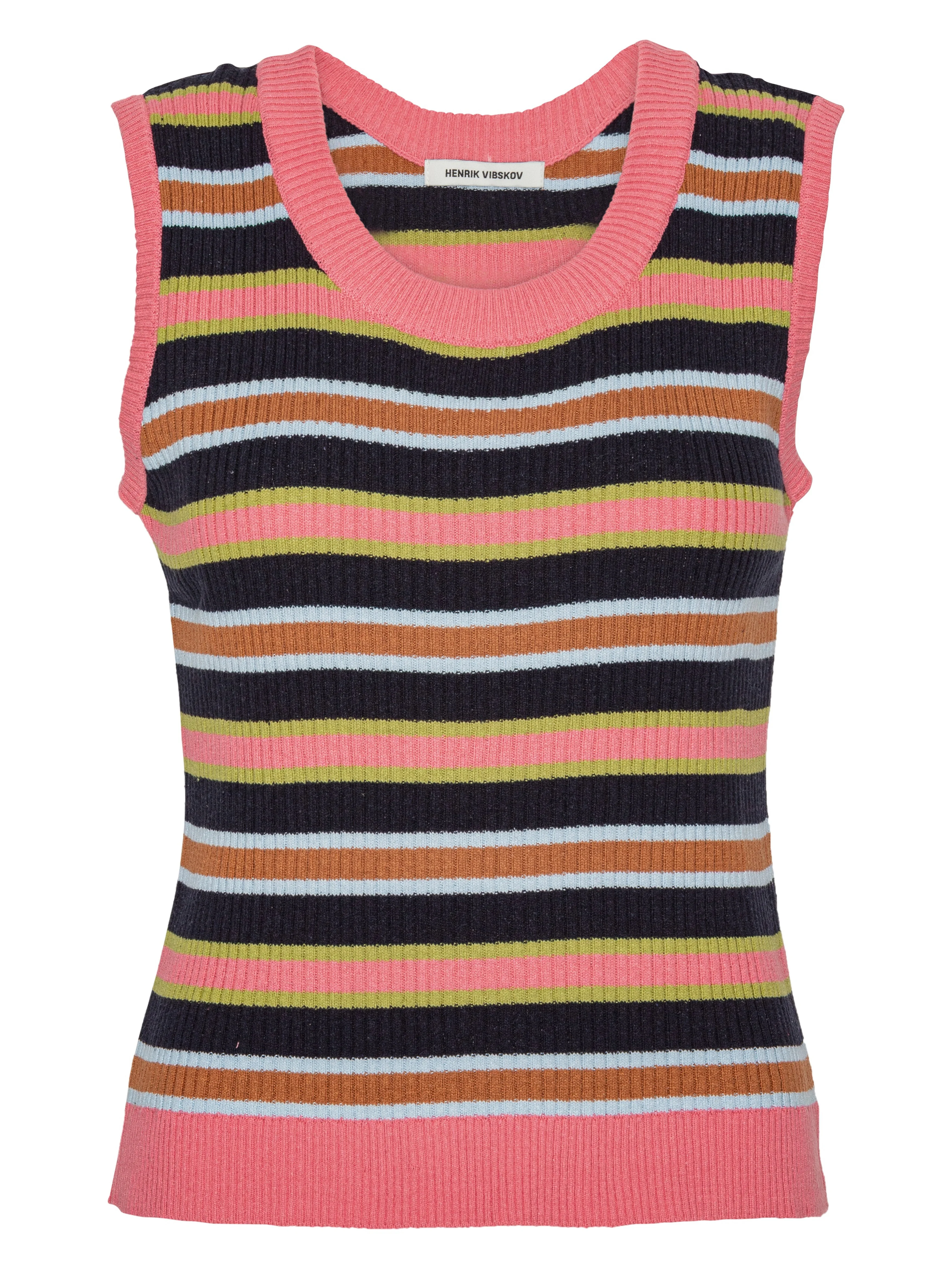 Silk Stripes Singlet in Navy Stripes from Henrik Vibskov Spring/Summer 2026 Studio Collection ‘Everything Cracks Eventually – I’ll Be Gentle.’ Highlights - multicolour - stripes - pink ribbed hems - round neck - sleeveless - fitted design - straight hem Model is 185cm tall and is wearing a size S Made in Bulgaria Designer ID: SS26STUD-F702 Colour ID: Navy Stripes Materials 100% Silk