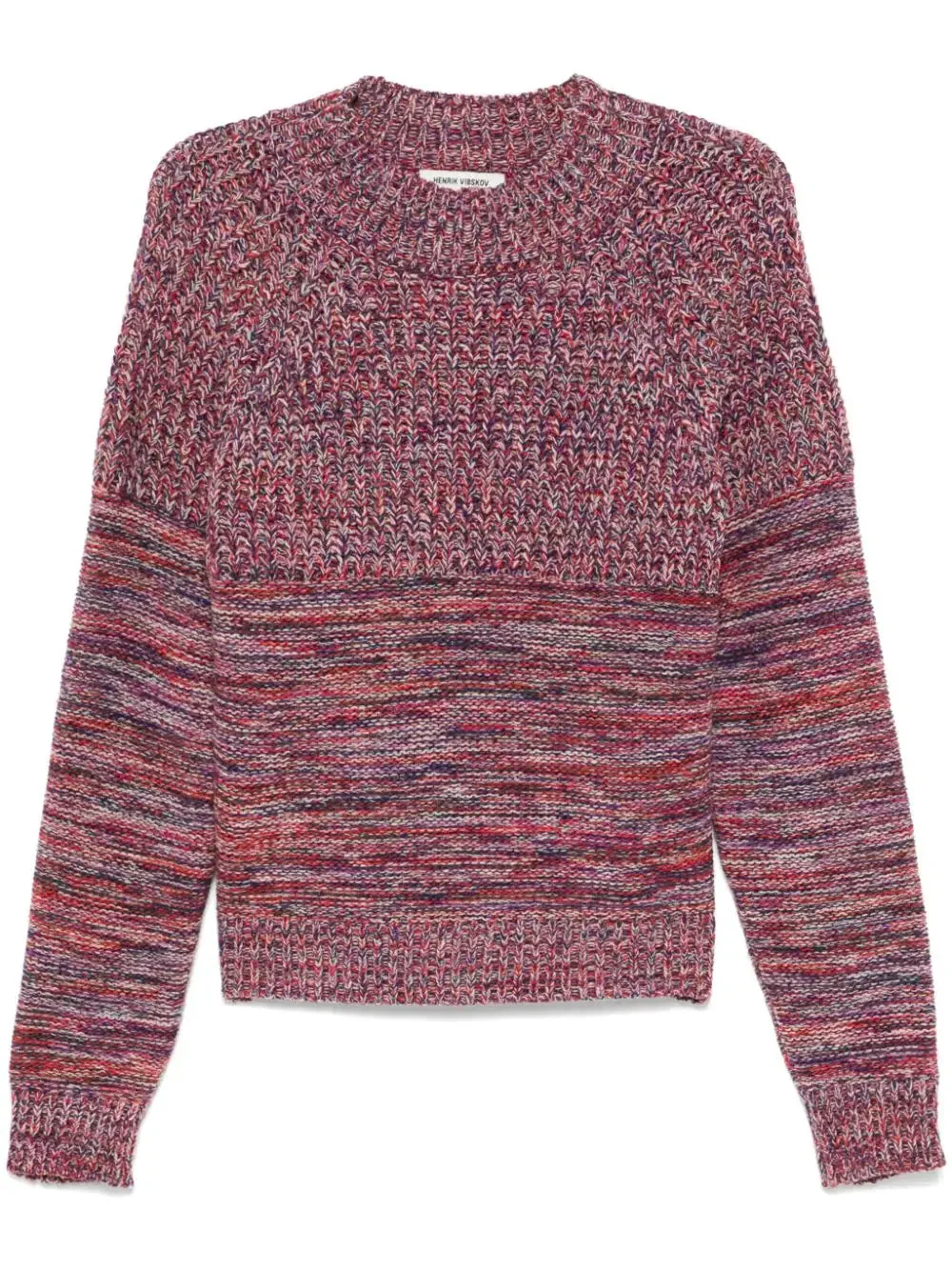 Six End Knit Jumper in Magenta Navy Orange Square from Henrik Vibskov's AW24 Key Collection Highlights - red, magenta, navy, orange - round neck - long sleeves - ribbed hems The model is 181 cm and is wearing a size small Made in Bulgaria Designer ID: AW24KEY-F702 Colour ID: 454 Magenta Navy Orange Square Materials 100% Wool