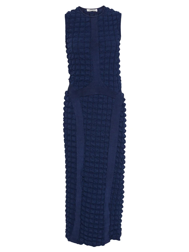 Tie Dress in Midnight Blue from Henrik Vibskov's SS25 Key Collection Highlights - dark blue - round neck - textured material - sleeveless - fitted design Model is 177cm tall and wears a size S The second model is 1.8 m wearing size S Made in Turkey Designer ID: SS25KEY-F801 Colour ID: 781 Midnight Blue Materials 50% Recycled Polyester 46% Polyester 4% Elastane