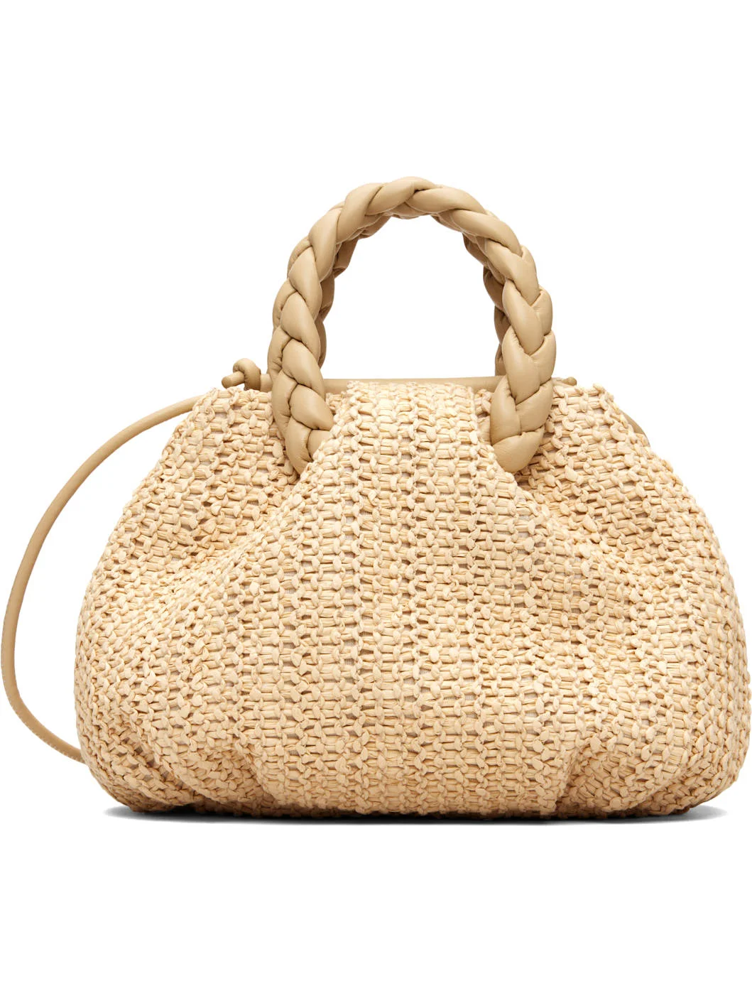 Woven raffia top handle bag. · Twin braided calfskin carry handles · Adjustable cord crossbody strap · Press-stud fastening at sides · Magnetic closure · Cotton canvas lining · H7" x W9" x D2.5" Supplier color: Natural Textile, calfskin. Made in Spain 261991F046006