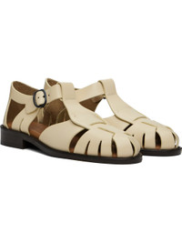 Handcrafted polished calfskin flat sandals in beige. · Cutouts throughout · Pin-buckle ankle strap · Logo embossed at padded calfskin footbed · Suede lining · Serrated detailing at welt · Stacked calfskin heel and midsole · Calfskin sole with rubber injection Supplier color: Custard Upper: calfskin. Sole: calfskin, rubber. Made in Spain 251991F124001