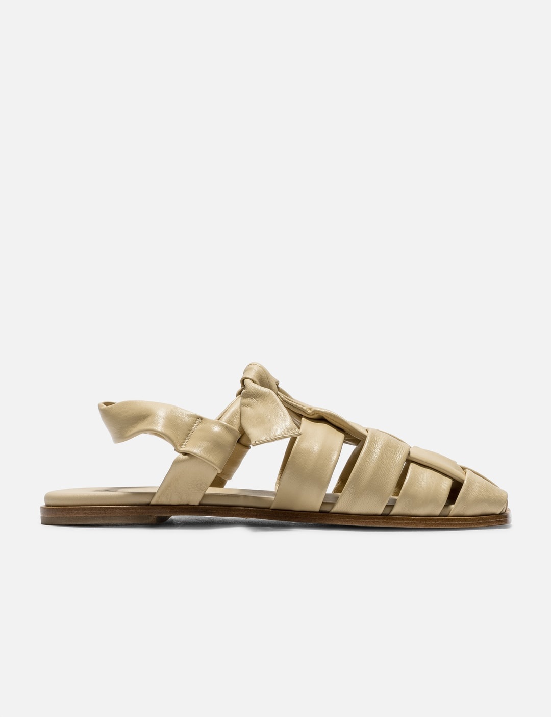 - Hereu - Bena - Interwoven knotted T-bar sandal - Italian supple lambskin - Square toe - Handmade in Spain by uniquely talented artisans - Flat rubber sole - Color: Oat - Material: Leather, Rubber - See more Sandals and Shoes
