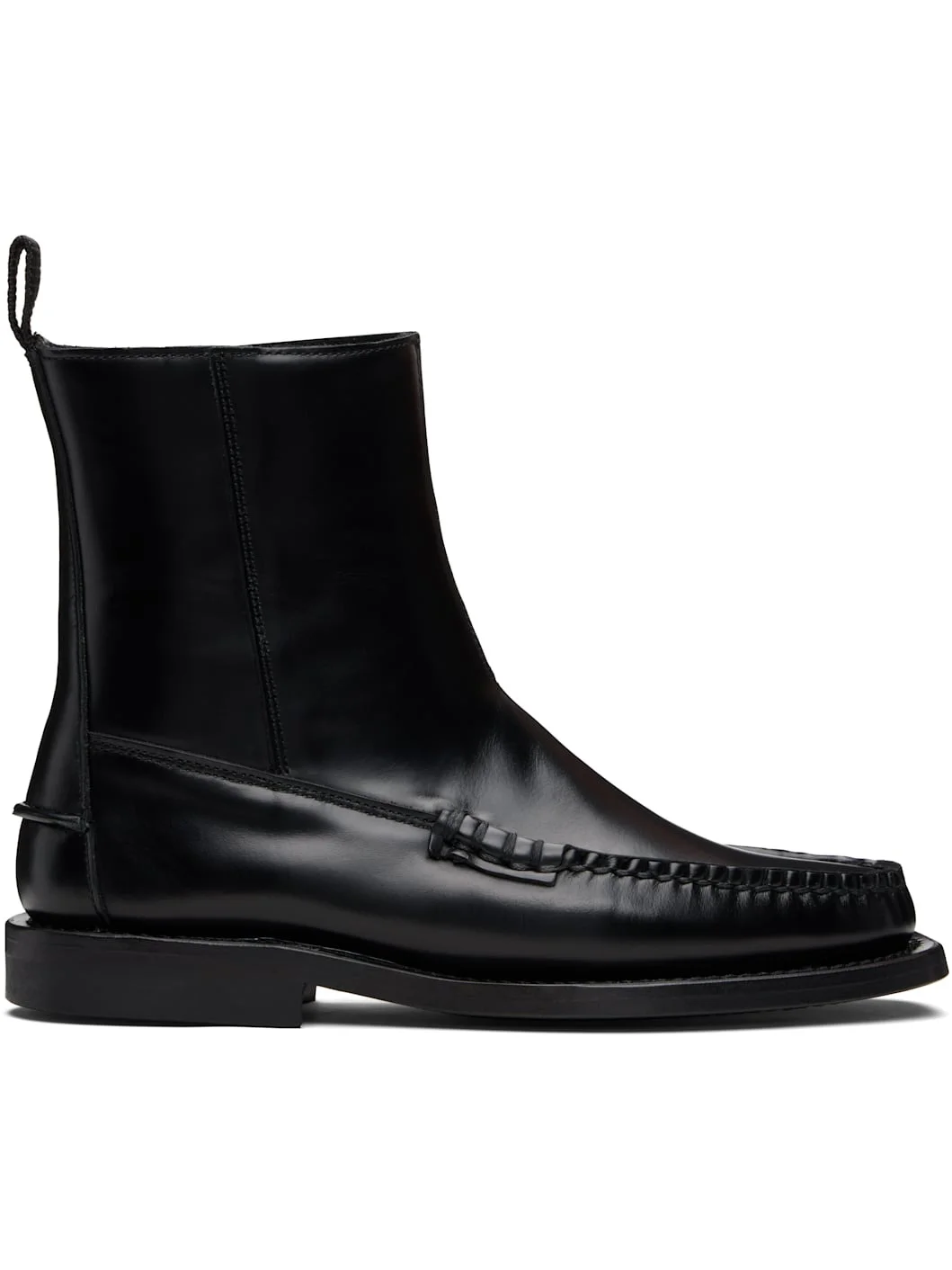 Handcrafted ankle-high buffed calfskin boots. · Paneled construction · Moc toe · Zip closure at inner side · Webbing pull-loop at heel collar · Pinched seam at heel counter · Stacked calfskin heel · Calfskin sole Supplier color: Black Calfskin. Made in Spain 252991F113007