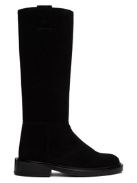 Knee-high paneled waxed suede boots in black. · Woven pull-loops at collar · Grained leather lining · Stacked leather heel with rubber injection · Leather sole with rubber injection · Heel: H1.75 in Supplier color: Black
