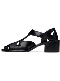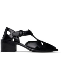 Handcrafted polished calfskin heels in black. · Cutouts and embroidered detailing throughout · Pin-buckle ankle strap · Logo embossed at calfskin footbed · Stacked calfskin block heel and midsole · Calfskin sole with rubber injection · Heel: H2" Supplier color: Black Upper: calfskin. Sole: calfskin, rubber. Made in Spain 251991F122000