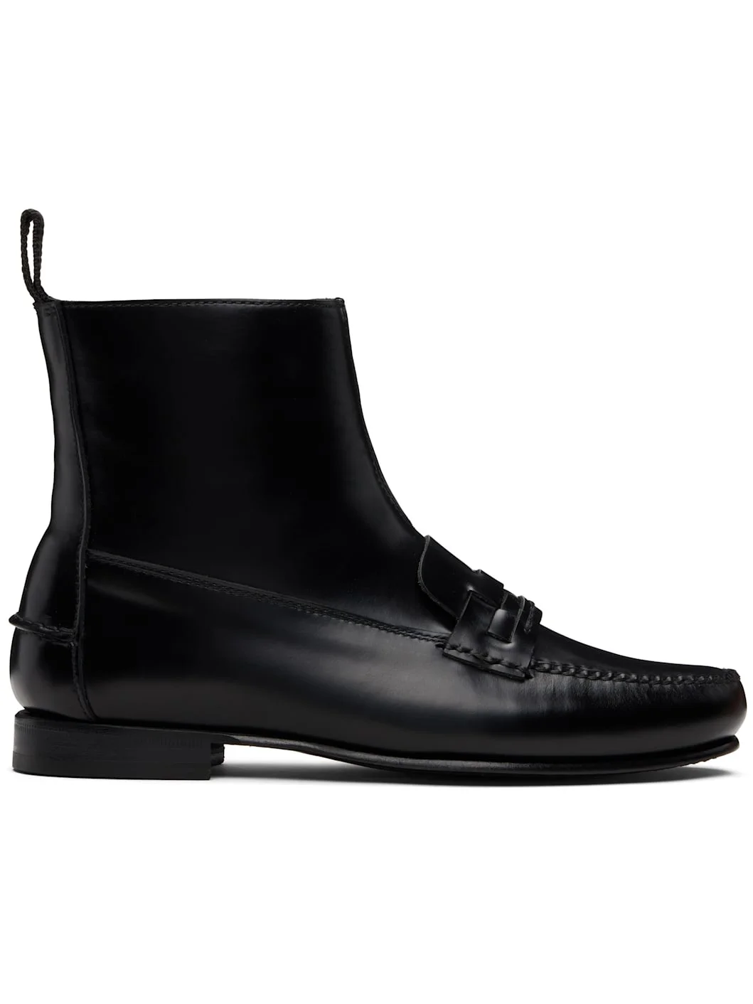 Handcrafted ankle-high buffed leather boots. · Moc toe · Basket-woven strap at vamp · Zip closure at inner side · Webbing pull-loop at heel collar · Pinched seam at heel counter · Stacked leather heel · Leather sole Supplier color: Black Leather. Made in Spain 252991F113004
