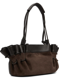 Calfskin suede top handle bag. · Whipstitching at knotted and adjustable shoulder strap · Pleats at sides · Magnetic closure · Calfskin lining · H7" x W12" x D6.5" Supplier color: Dark brown Calfskin. Made in Spain 252991F048005