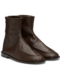 Handcrafted ankle-high grained calfskin boots. · Moc toe · Zip closure at heel · Suede interior · Stacked calfskin heel · Calfskin sole Supplier color: Dark brown Calfskin. Made in Spain 252991F113005
