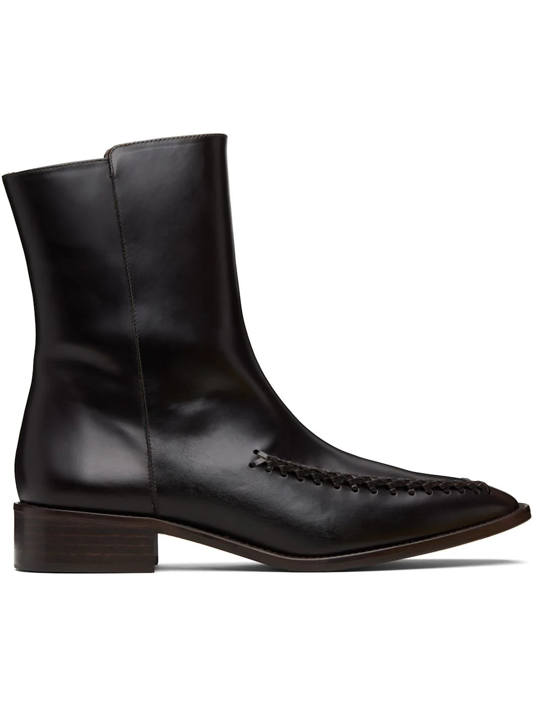 Ankle-high polished calfskin boots. · Almond toe · Braided detailing at vamp · Zip closure at inner side · Topstitching at welt · Stacked leather heel with rubber injection · Calfskin sole · Heel: H1.5" Supplier color: Ebony Upper: calfskin. Sole: calfskin, rubber. Made in Spain 252991F113000
