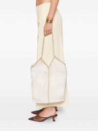 double-handle tote bag Highlights - Cream - Silk body - Beige trim - Top handles - Unstructured shape Imported Composition Lining: Silk 90%, Calf Leather 10% Outer: Silk 80%, Wool 60%, Cotton 40%, Calf Leather 20% SIZE & FIT Model measurements Height 5 ft 9 in(1.76 m) Bust/Chest 32.28 in(82 cm) Hips 35.43 in(90 cm) Waist 25.19 in(64 cm) Measurement DEPTH 3.93 in(10 cm) HANDLE 11.81 in(30 cm) HEIGHT 14.56 in(37 cm) WIDTH 14.56 in(37 cm)