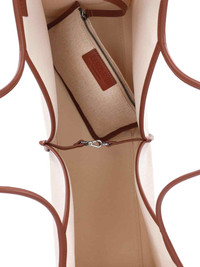 HEREU 'CALELLA SQUARED' CREAM COTTON BLEND TOTE BAG WITH BROWN LEATHER TRIM, TWO HANDLES, HOOK CLOSURE, REMOVABLE INNER ZIP POUCH, FRONT LOGO PATCH DETAIL, MAIN INNER COMPARTMENT. PRODUCT INFO PRODUCT CODE CASQWBS25NATURAL CHESTNUT COMPOSITION: 45% JUTE, 45% COTTON, 10% CALF LEATHER SIZE AND FIT: H 37 X W 50 X D 21 CM MADE IN: SPAIN - TRIMS: 100% CALF LEATHER - HANDLE DROP - POUCH SIZE: H 13 X L 20 CM
