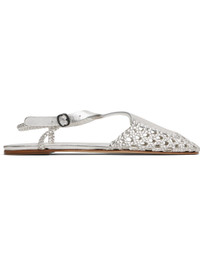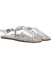 Hand-woven grained lambskin sandals in metallic silver tone. · Square toe · Pin-buckle ankle strap · Fixed slingback strap · Logo embossed at padded leather footbed · Calfskin sole with rubber injection Supplier color: Light silver Upper: lambskin. Sole: calfskin. Made in Spain 251991F121000
