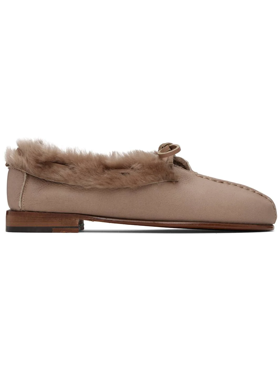 Shearling loafers. · Topstitching and pinched seam at vamp · Lace-up closure · Stacked leather heel with rubber injection · Leather sole Supplier color: Taupe Upper: sheepskin. Sole: leather, rubber. Made in Spain 252991F121011