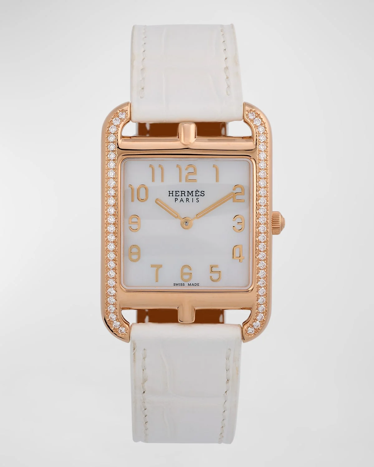 • Case: 18-karat rose gold set with 52 diamonds (0.57 ct), 29 x 29 mm • Antiglare sapphire crystal • Water-resistant to 30 m • Dial: white mother-of-pearl • Movement: quartz, made in Switzerland • Functions: hours, minutes • Bracelet: matte chantilly alligator, interchangeable, rose gold pin buckle Online Inquiries: NMS21_PFTHH Store Inquiries: #4558885