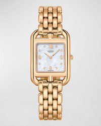 - Small model, 31 mm - Lug to lug height: 31 mm - Case width: 23 mm - 18-karat rose gold case - Anti-glare sapphire crystal - Diamond-set white mother-of-pearl dial, 8 diamond-set chatons (0.02 total carat weight) - Quartz movement, Swiss Made - Hour, minute functions - Water-resistant to 3 bar - One size single tour bracelet in 18-karat rose gold, folding clasp - Hermes Style # W059549WW00