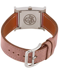 - About the brand: An unmistakable luxury icon. - Circa 2000s - This is an authentic, pre-loved Hermes piece. It's possible that there may be some gentle wear. - Quartz movement - Pink leather strap - Pin buckle clasp - Stainless Steel bezel - Stainless Steel case - Sapphire crystal - Push down crown - Pink dial - Date display - Case: 21mm - Bracelet/strap: 15mm wide x 7in long - Manufacturer's limited warranty - Independent Appraisal and Generic Box - The Watch Size Guide