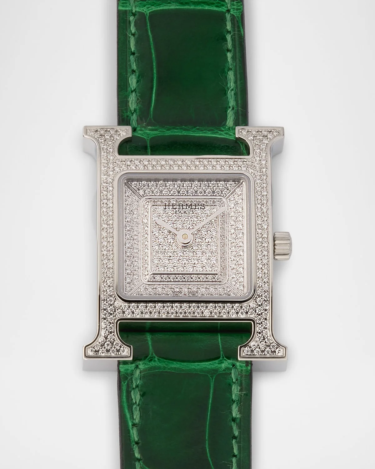 - Small model, 25 mm - Lug to lug height: 25 mm - Case width: 21 mm - Diamond-set steel case 192 diamonds (~ 0.412 tcw) - Anti-glare sapphire crystal - Diamond-set beveled dial, 196 diamonds (~ 0.507 tcw) - Quartz movement - Hour, minute functions - Water-resistant to 3 bar. - Short single tour strap in smooth green alligator - Steel pin buckle - Avoid all contact with water while wearing your Hermes leather watch. - Made in Switzerland