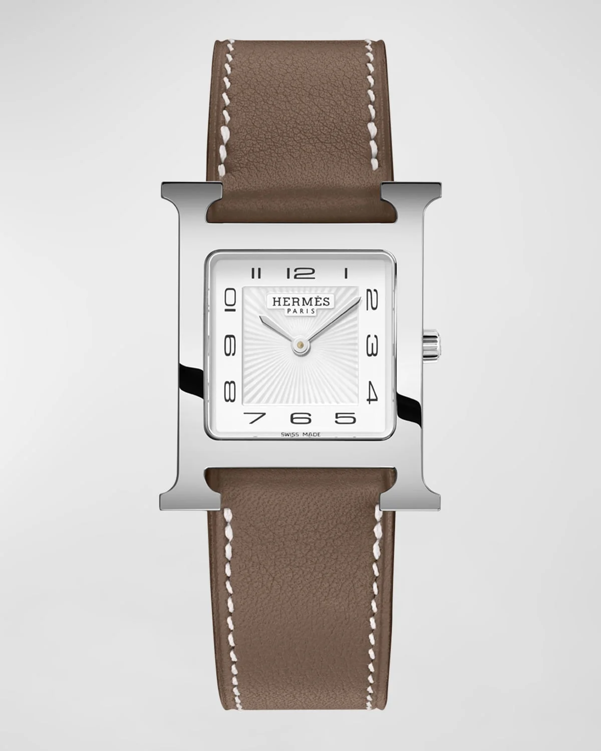 • Case: steel, 26 x 26 mm • Anti-glare sapphire crystal • Water-resistant to 30 m • Dial: white with sun pattern • Movement: quartz, made in Switzerland • Functions: hours, minutes • Bracelet: smooth etoupe calfskin, interchangeable, steel pin buckle • 2-Year International Warranty Hermès Style # W036796WW00 Online Inquiries: NMS21_PDK0C Store Inquiries: #546490 Time, an Hermès object. Hermès creates objects. Objects shaped by the hands of artisans to make them true companions for those who wear them. Practical, functional and stemming from uncompromising expertise, they radiate the lightness of the unexpected. They make everyday life their playground, and each instant a uniquely special moment. For Hermès, time is also an object. Its inherent tension is translated by the house into a singular characteristic. Rather than measuring, ordering, and seeking to control it, Hermès dares to explore another time, designed to arouse emotions, open up interludes and create spaces for spontaneity and recreation.
