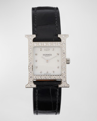 • Case: Stainless steel set with 132 diamonds (0.878 ct), 21 x 21 mm • Anti-glare sapphire crystal • Water-resistant to 30 m • Dial: natural white mother-of-pearl set with 11 diamond markers (0.031 ct) • Movement: quartz, made in Switzerland • Functions: hours, minutes • Bracelet: smooth black alligator, steel pin buckle Online Inquiries: NMS21_PG8KG Store Inquiries: #4652188