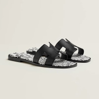 Sandal in calfskin with iconic "H" cut-out and calfskin insole with "Op'H" print. An iconic Hermes style, this silhouette is an essential piece in every wardrobe. Made in Italy Product details Black leather sole Black leather heel "Op'H" printed Nappa leather insole Black goatskin lining