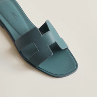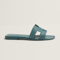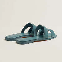 Sandal in calfskin with iconic "H" cut-out. An iconic Hermes style, this silhouette is an essential piece in every wardrobe. Made in Italy Product details Natural leather sole Spruce blue leather heel Spruce blue goatskin insole and lining