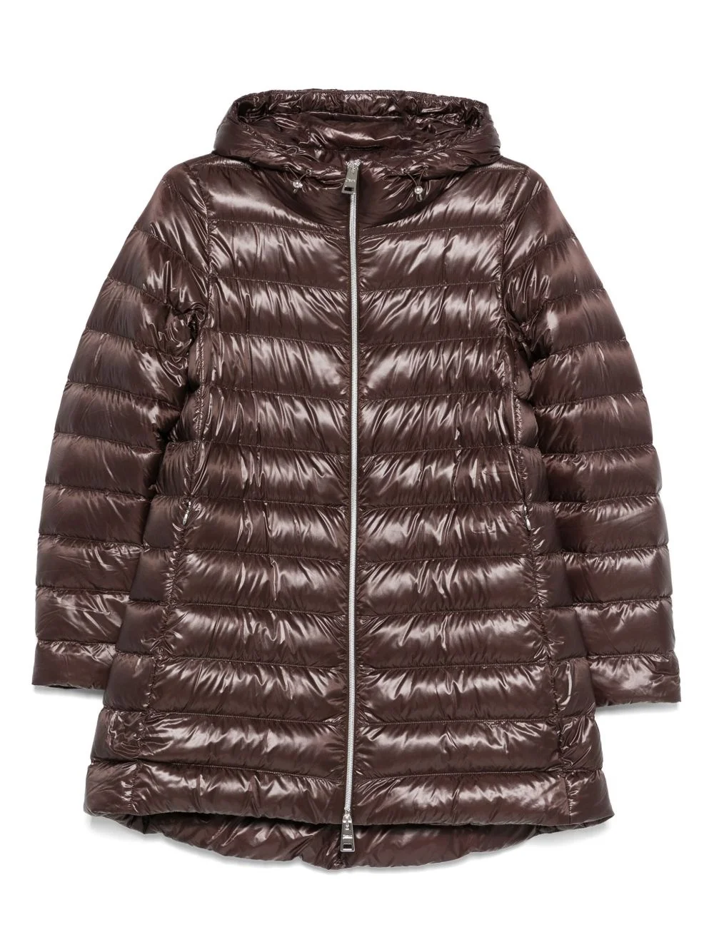 quilted puffer jacket Highlights - Chocolate brown - Front two-way zip fastening - Drawstring hood - Two side zip-fastening pockets - High-shine finish Imported Composition Lining: Polyamide 100%, Goose Down 90%, Goose Feather 10% Outer: Polyamide 100% SIZE & FIT Model measurements Height 5 ft 10 in(1.78 m) Bust/Chest 31.49 in(80 cm) Hips 37 in(94 cm) Waist 23.62 in(60 cm) FittingInformation Designed for a relaxed fit, this piece allows for comfort and movement when worn Made from a padded non-stretch fabric, giving it no natural elasticity Washing instructions Dry Clean Only