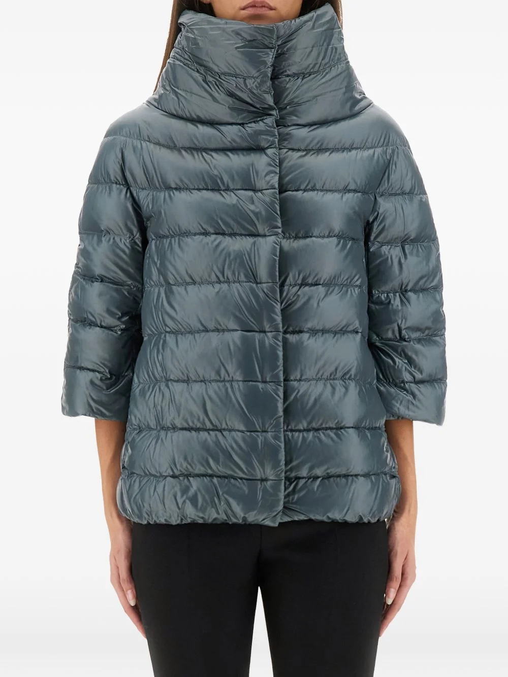 Aminta funnel-neck three-quarter-sleeves jacket Highlights - Light blue - Funnel-neck - Three-quarter sleeves - Horizontal-quilting-pattern - Front snap button-fastening - Padded-design Imported Composition Outer: Polyamide 100% Lining: Polyamide 100%, Down 90%, Feather 10% SIZE & FIT FittingInformation Designed for a relaxed fit, this piece allows for comfort and movement when worn The elasticated hem allows for movement and a comfortable fit Made from a padded non-stretch fabric, giving it no natural elasticity Washing instructions Read Manufacturer Guidelines