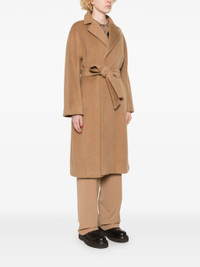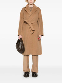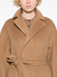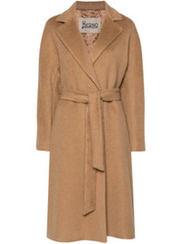 camel brown brushed effect belted waist notched lapels long sleeves belt loops detachable and adjustable waist tie two side inset pockets full logo-jacquard lining wrap design straight hem below-knee length - Color: NEUTRALS - Made in: Italy - Designer Style ID: 33420 CA000549D 2157 Composition and care Lining Composition Viscose: 100.0%, Outer Composition Camel Hair: 100.0%