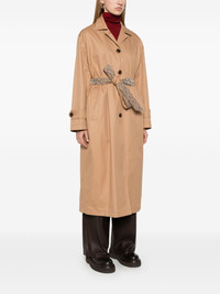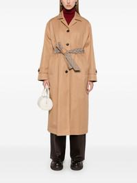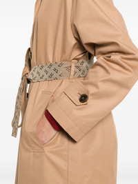 belted trench coat Highlights - Camel brown - Cotton - Gabardine weave - Front button fastening - Notched lapels - Long sleeves - Buttoned cuffs - Belted waist - Two side welt pockets - Central rear vent - Full lining - Straight hem - Mid-length Made in Italy Composition Outer: Cotton 100% Lining: Viscose 71%, Polyester 29% SIZE & FIT Model measurements Height 5 ft 9 in(1.75 m) Bust/Chest 31.88 in(81 cm) Hips 34.64 in(88 cm) Waist 24.01 in(61 cm) FittingInformation Designed to be unstructured, offering a loose fit throughout The tie fastening gives an adaptable and personalised fit Made from a midweight non-stretch fabric