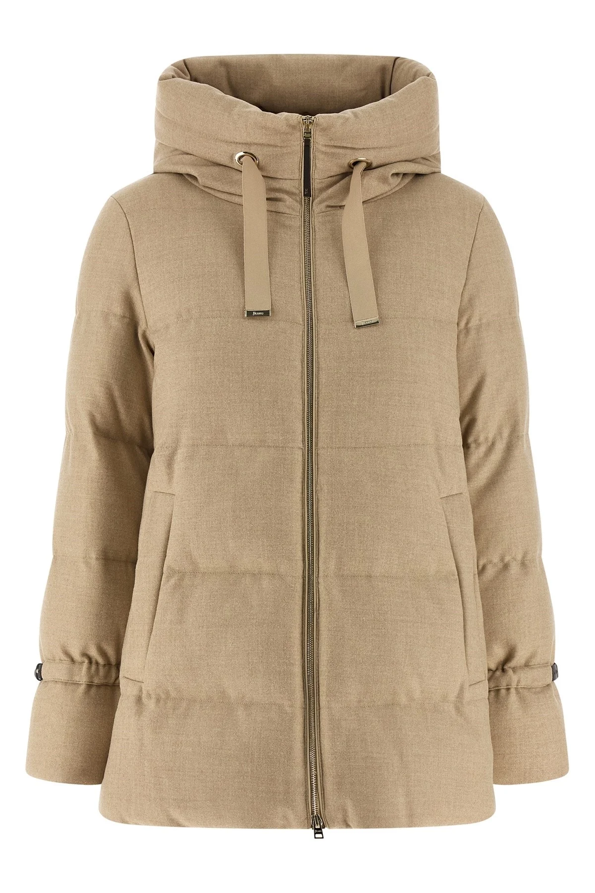 cod. PI002104D334671985 Worked wool jacket with a wavy bi-stretch texture and quilted lurex inserts with goose down padding, adjustable hood with tone-on-tone maxi grosgrain tape, high neck, front zip closure, pockets, long sleeves with adjustable leather strap on the cuffs. Color: Beige Size & Fit: true to size fit Composition: 92% wool 5% metallic fiber 3% elastane Made in: Italy