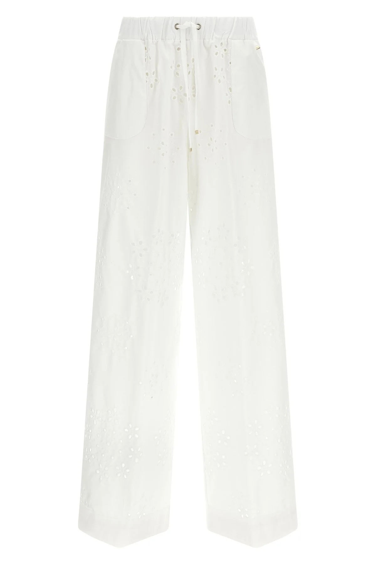 cod. PT000221D13322RIC1000 'Broderie Anglaise' cotton pants with embossed embroidery and perforated patterns, lining, wide and straight leg, drawstring elastic waistband, welt pockets, turn-up on the leg bottom. Color: White Size & Fit: true to size fit Composition: 98% cotton, 2% polyester Made in: Italy
