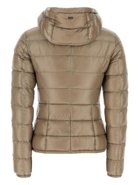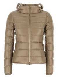 hooded quilted jacket Herno blends contemporary style with practicality in this feather-down padded jacket, evident in its taupe brown hue and high-shine finish. Highlights Imported Composition Lining: Polyamide 100% Outer: Polyamide 100% Down 90%, Feather 10%