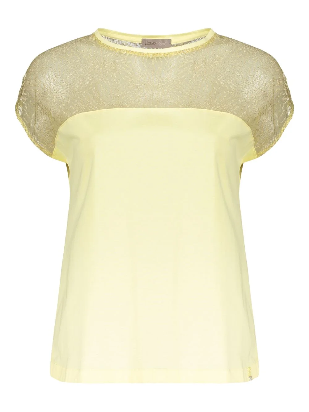 crew-neck top Highlights - Yellow - Lace panel - Round neck - Short sleeves Imported Composition Cotton 100%, Polyamide 67%, Metallic Fibre 33% Washing instructions Read Manufacturer Guidelines