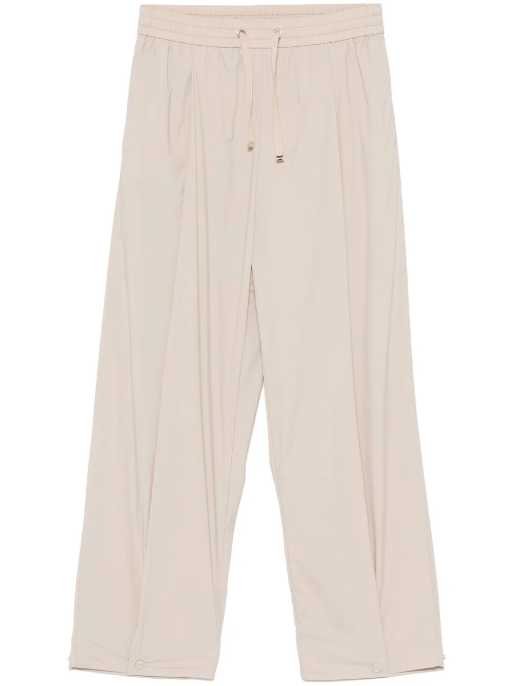 tapered-leg trousers Highlights - Light beige - Elasticated drawstring waistband - Two side slit pockets - Rear welt pocket - Press-stud fastening cuffs Imported Composition Polyamide 86%, Cotton 55%, Polyester 45%, Elastane 14% SIZE & FIT Model measurements Height 5 ft 9 in(1.76 m) Bust/Chest 31.1 in(79 cm) Hips 36.61 in(93 cm) Waist 24.8 in(63 cm) FittingInformation Designed for a tapered fit, these trousers allow for a close fit at the waist and a loose unrestricted fit over the leg with a closer fit towards the ankle The elasticated waist allows for a comfortable fit Made from a lightweight stretch fabric, this piece offers elasticity and flexibility when worn Washing instructions Machine Wash